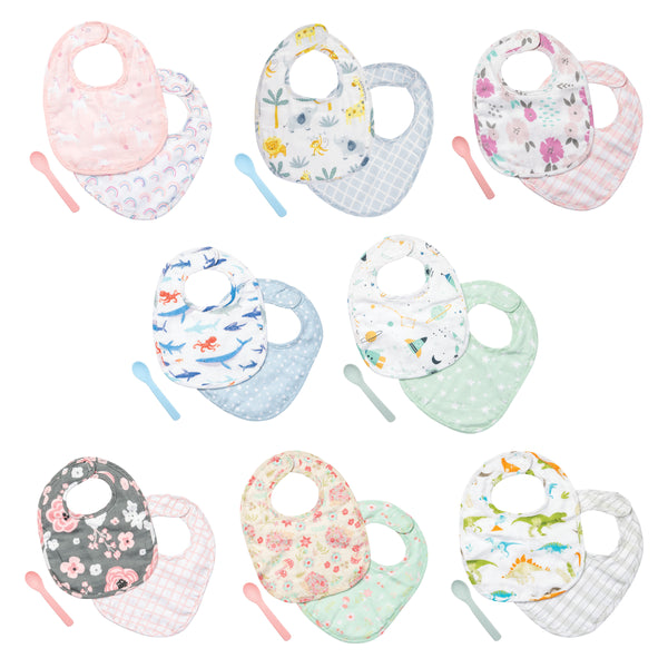 The perfect gift has arrived! These super cute sets of 2, 100% cotton muslin bibs with a coordinating spoon are the perfect gift for new moms, baby showers, birthdays, or a gift for yourself. The bibs are machine washable and the spoon is completely dishwasher safe. We are loving these sets with their soft colors and precious prints that are perfect for any little one in your life.