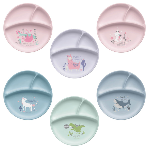 Make mealtime more fun for everyone with these amazing silicone plates fitted with a suction cup on the bottom to keep the plate exactly where you want it while your kiddo eats *plays with* their meal. Designed with adorable prints in the largest of 3 compartments on the plate and made from an ultra soft silicone that is dishwasher safe. This plate is every parent or care givers dream and coordinates back with the rest of the meal time collection from Stephen Joseph.