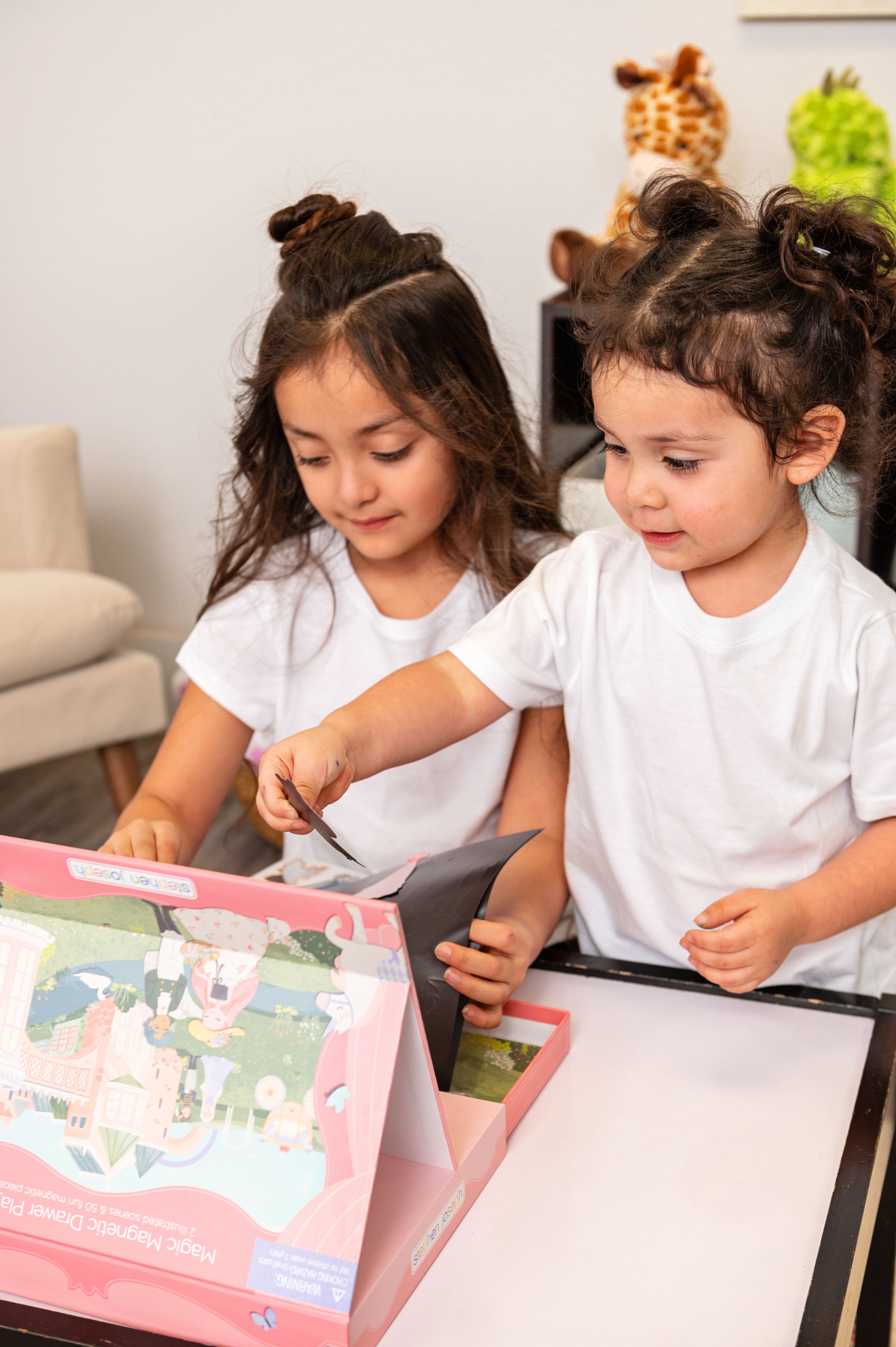 Great for playtime on-the-go, our new magnetic scenes with drawer provide endless hours of fun for little ones! Pick from any of our colorful, imaginative scenes with dinosaurs, zoo animals, princesses or mermaids. Each design comes with 2 interchangeable magnetic backdrops and over 50 magnetic pieces, for endless possibilities. Fold down the lid and store the magnetic pieces in the convenient storage drawer for easy clean-up. Kids with love creating their story masterpiece no matter where the adventure takes them! Great for road trips, sleepovers, and more.